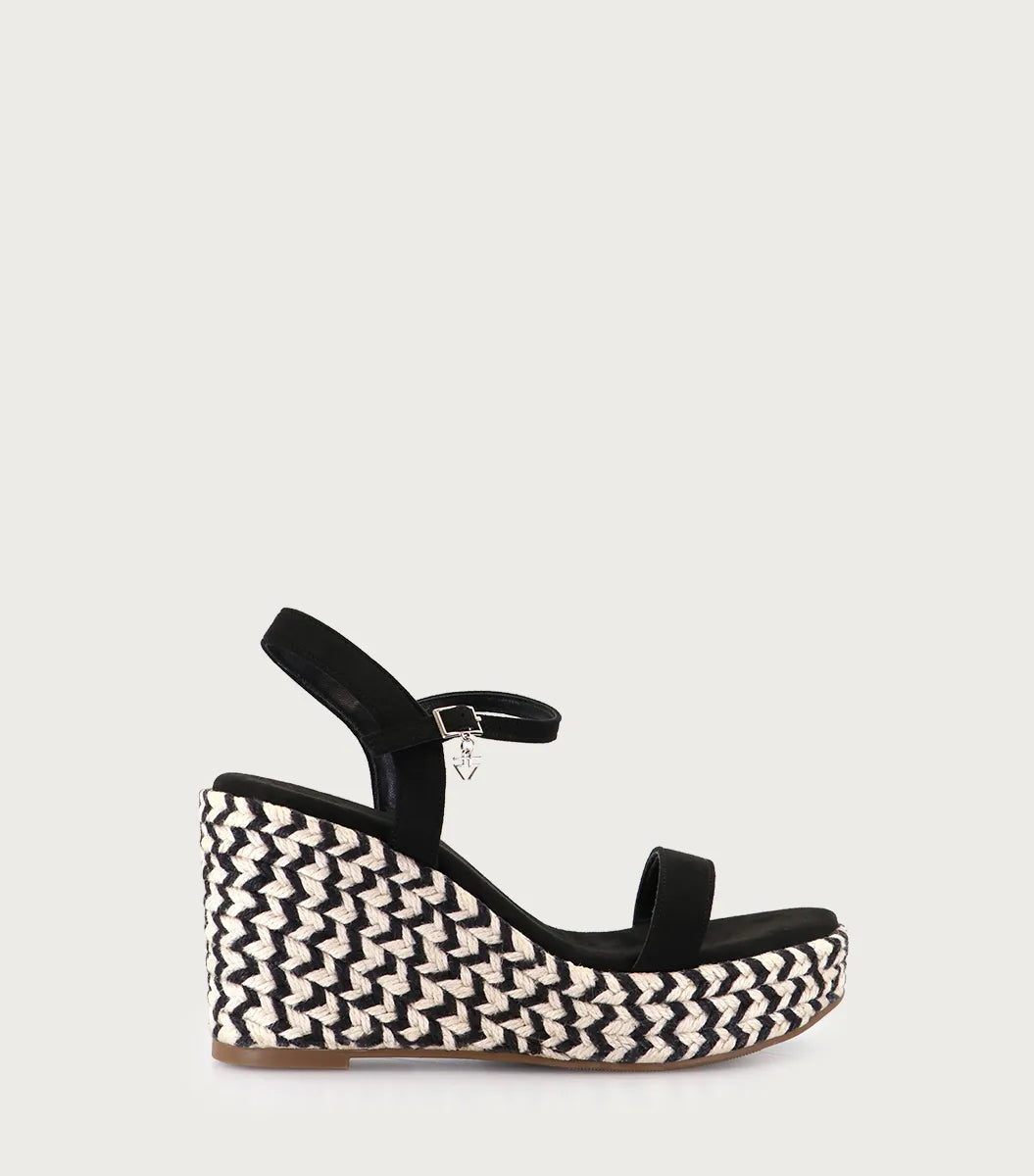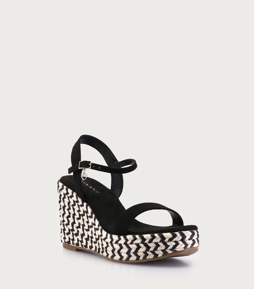 Plataforma Chun negra en microfibra con hebilla y logo. Forrada en tiras de yute bicolor con suelín al tono. Altura de plataforma 9 cm. Un modelo fresco y natural.